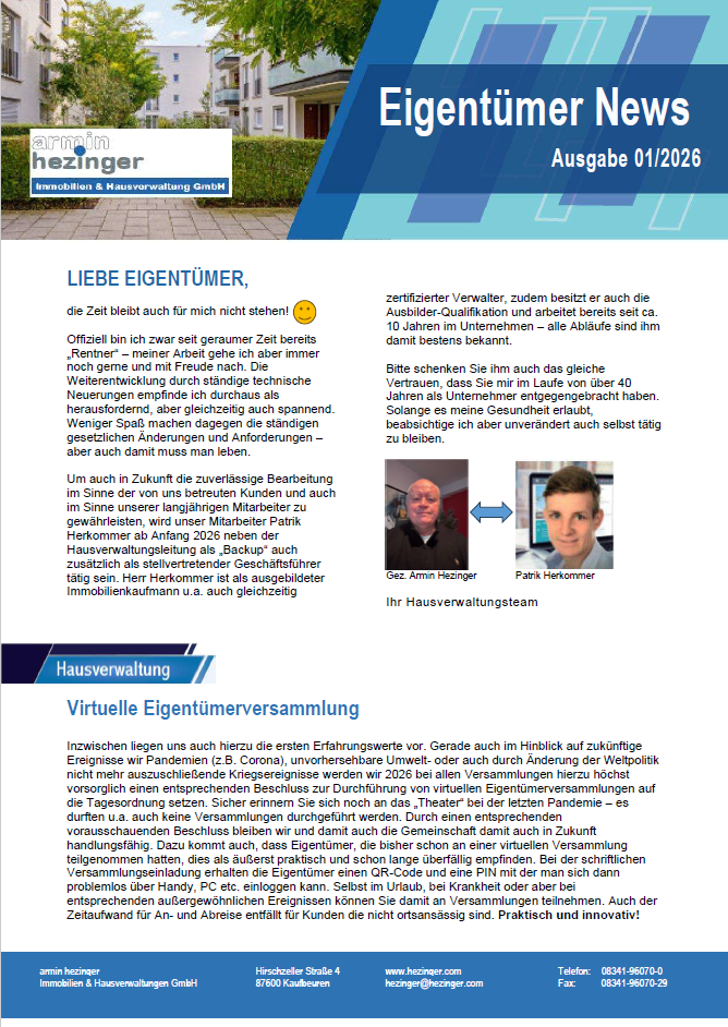 Schön, dass Sie auf unserer Website vorbeischauen. Gerne überzeugen wir Sie durch Leistung, Zuverlässigkeit, günstige Preisgestaltung, möglichst viel Service und vor allem auch viel Erfahrung - profitieren Sie von mehr als 40 Jahren (seit 1984) Knowhow rund um die Immobilie. Wir freuen uns über Ihre Kontaktaufnahme.Armin Hezinger, Geschäftsführender Gesellschafter